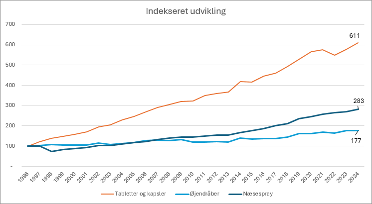 I samme periode er forbruget af øjendråber næsten tredoblet, mens næsespray er knap fordoblet:
