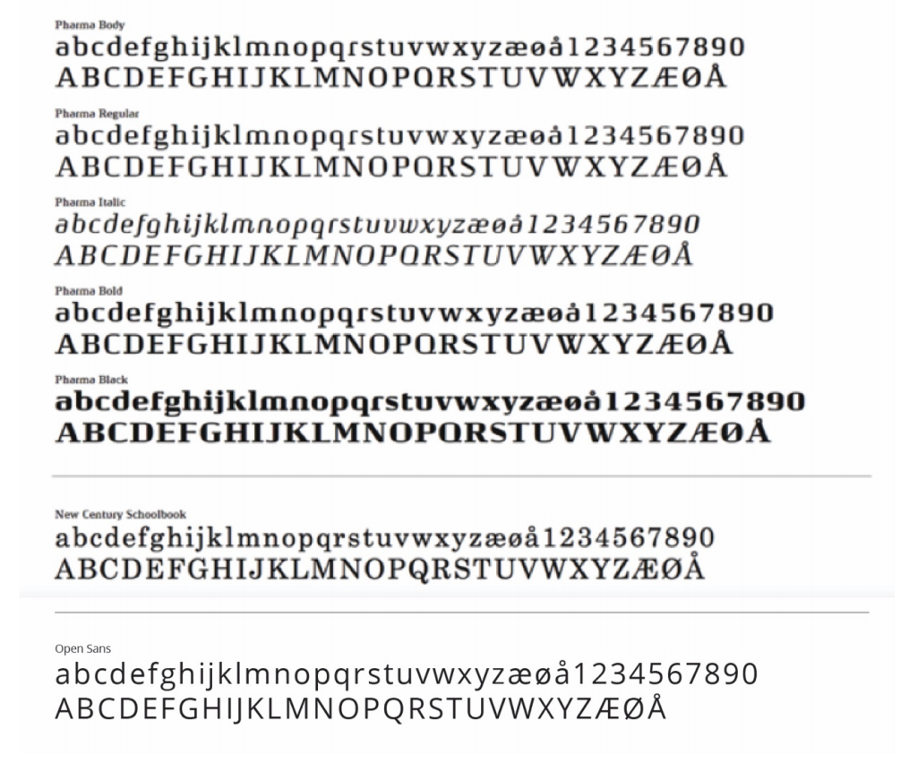 Pharma bruges som den primære typografi. Pharma-typografien må ikke justeres eller ændres uden tilladelse.